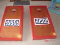 Our standard regulation sized boards, stained in a golden oak color, with your custom logo and painted border color of your preference. Polyurethaned to a high gloss finish that plays as good as it looks. Comes with 8 bags of your color choice. Please email for quotes and graphic information.